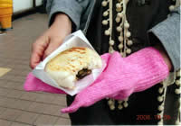 いたるところでおやきの看板。信州のおやきはみんな白いもちっとした生地。具は、野沢菜やなすなど、おかず系が多かった。おいしい! 150〜200円くらい。 |